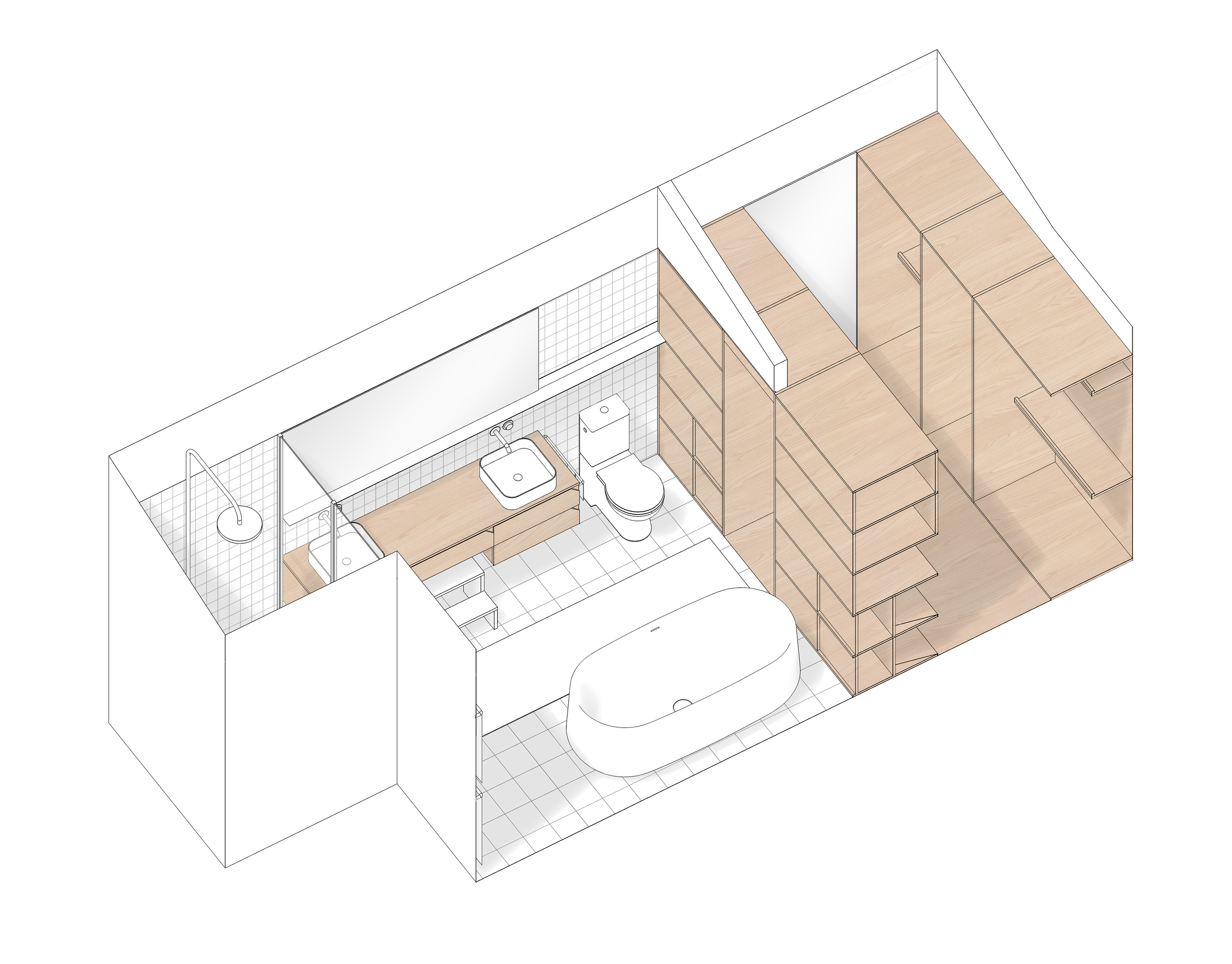 This project in California is an addition to a single-family home. It infills a rectangular void in the footprint of the existing house, creating a new bathroom and closet adjacent to the master bedroom.